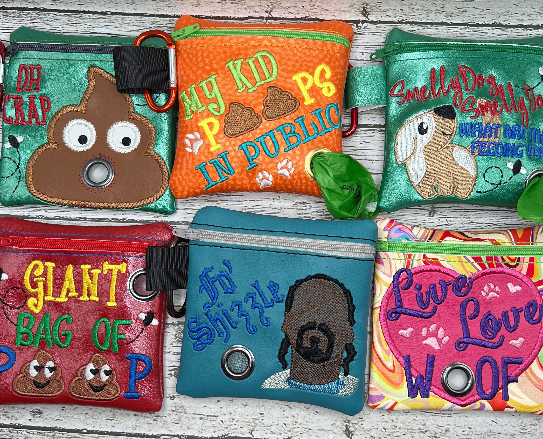 The perfect bag to hold your disposable plastic poo bags. Ditch those cheap plastic holders from the box stores. These bags are made with marine vinyl, seatbelt webbing and a carabiner or swivel lobster clasp to attach them to your leash or belt loop. They are machine embroidered to perfection and have a metal grommet for added durability. They can also hold a small bottle of hand sanitizer. Each bag will come with one roll of disposable dog poo bags. Spot Clean Only. Each Bag is approximately 4.5" wide x 4.5" high.
